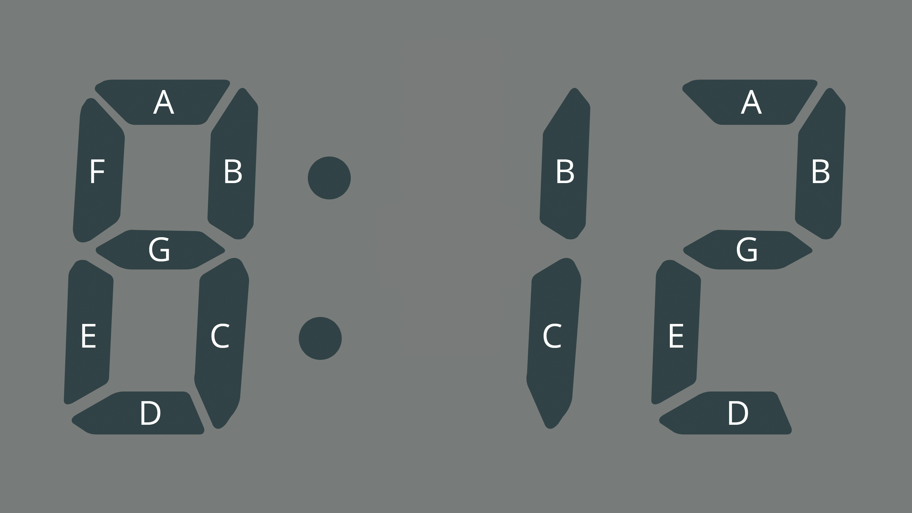 In this image of a clock, you can see where the 8 has all segments (A-G) energized. You can display a 1 by energizing only segments B and C, and a 2 by energizing segments A, B, D, E and G.